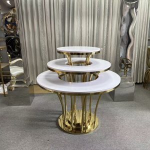 Luxury-lite gold stainless steel three-layer cake table – Wedding dessert display stand – Banquet white circular table setting props